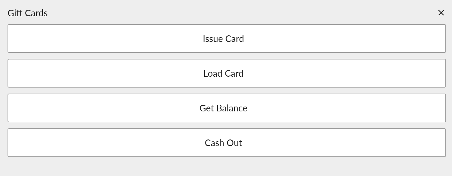 Opens menu of actions related to gift cards, such as issuing a new gift card or doing a balance inquiry or adding money to